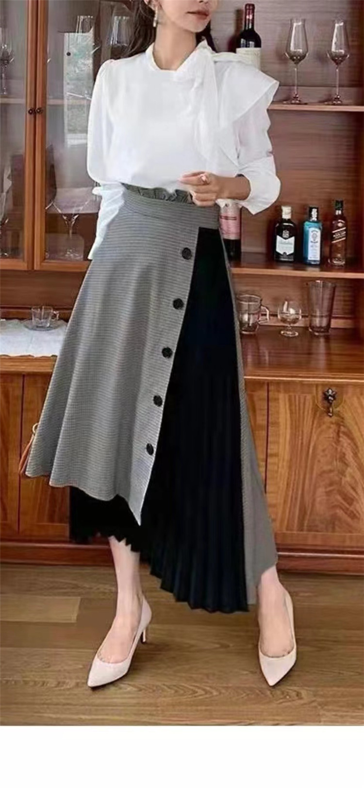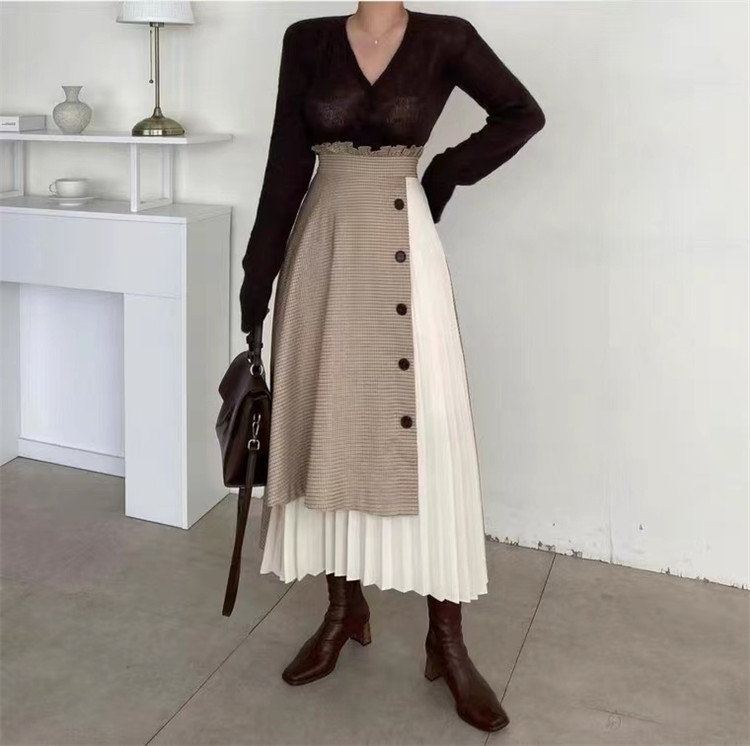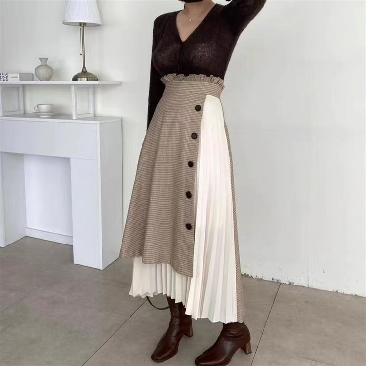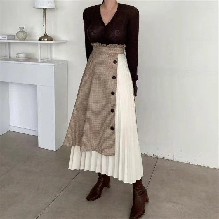 上品なチェック柄とボタンデザインが魅力的なプリーツスカート。