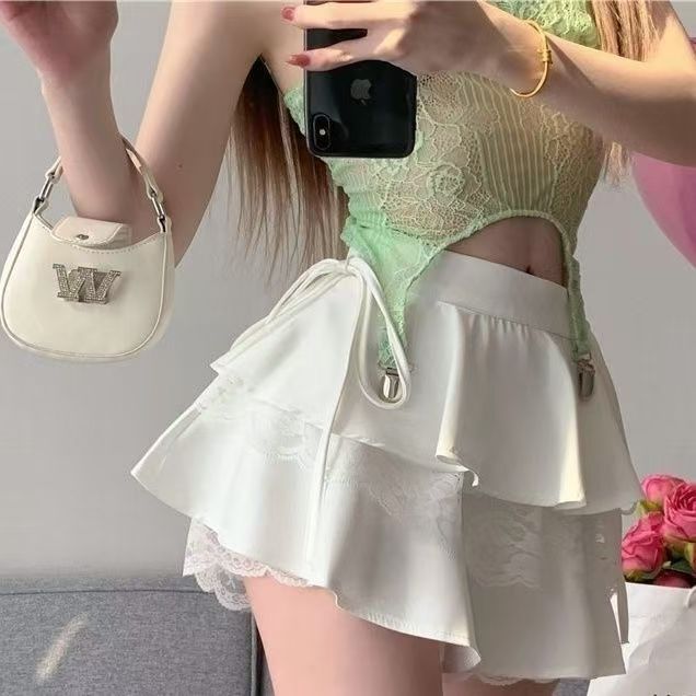 ミニ丈ながら裾のレース装飾が上品さを演出し、動くたびに揺れるティアードシルエットが女性らしさを引き立てます。